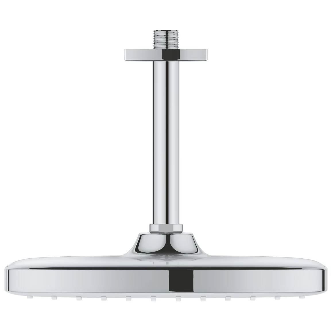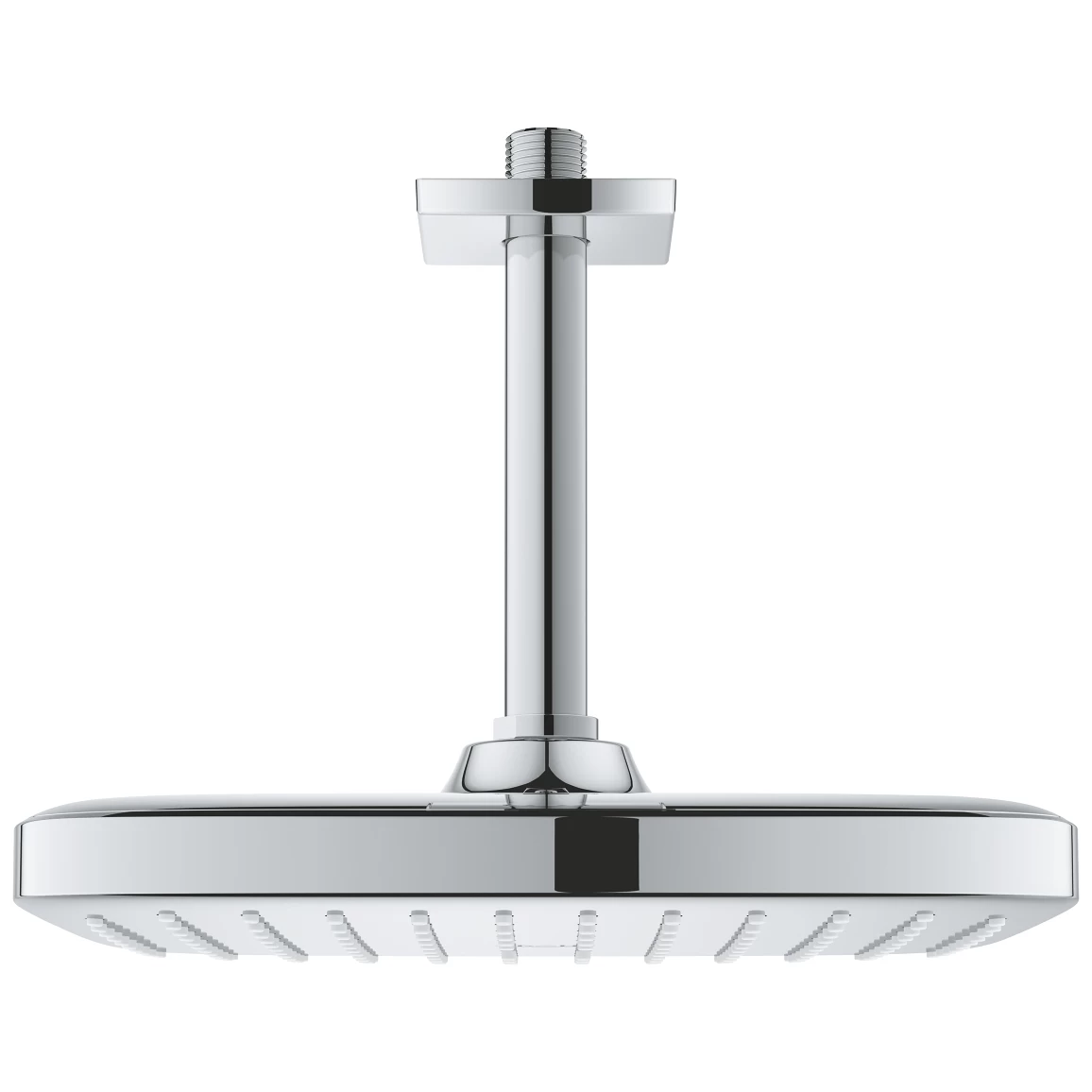 This ceiling-mounted soft square head shower has a wide 250mm face, and a 142mm shower arm with square escutcheon, providing lots of space to spread out. It comes with the gentle, refreshing rain spray pattern, enhanced by Grohe DreamSpray, which keeps the flow from every nozzle equal and consistent, for a more enjoyable experience. Grohe EcoJoy limits the water flow to 9.5 litre/minute but still delivers pure and satisfying indulgence. SpeedClean nozzles on the shower head can be brushed clean of limescale with a finger for easy maintenance. Inside, an insulated inner waterguide keeps the surface from becoming too hot, protecting the dazzling but durable Grohe StarLight chrome finish.