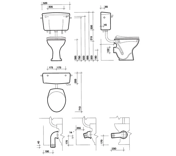 - Fixings – WC screwed to the floor, cistern screwed to the wall and supported on brackets.